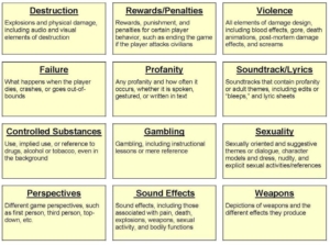 Over 30 different content descriptors are currently employed by the ESRB rating system. They span various categories of concern to parents, including but not limited to violence, language, suggestive or sexual content, gambling and use of controlled substances.